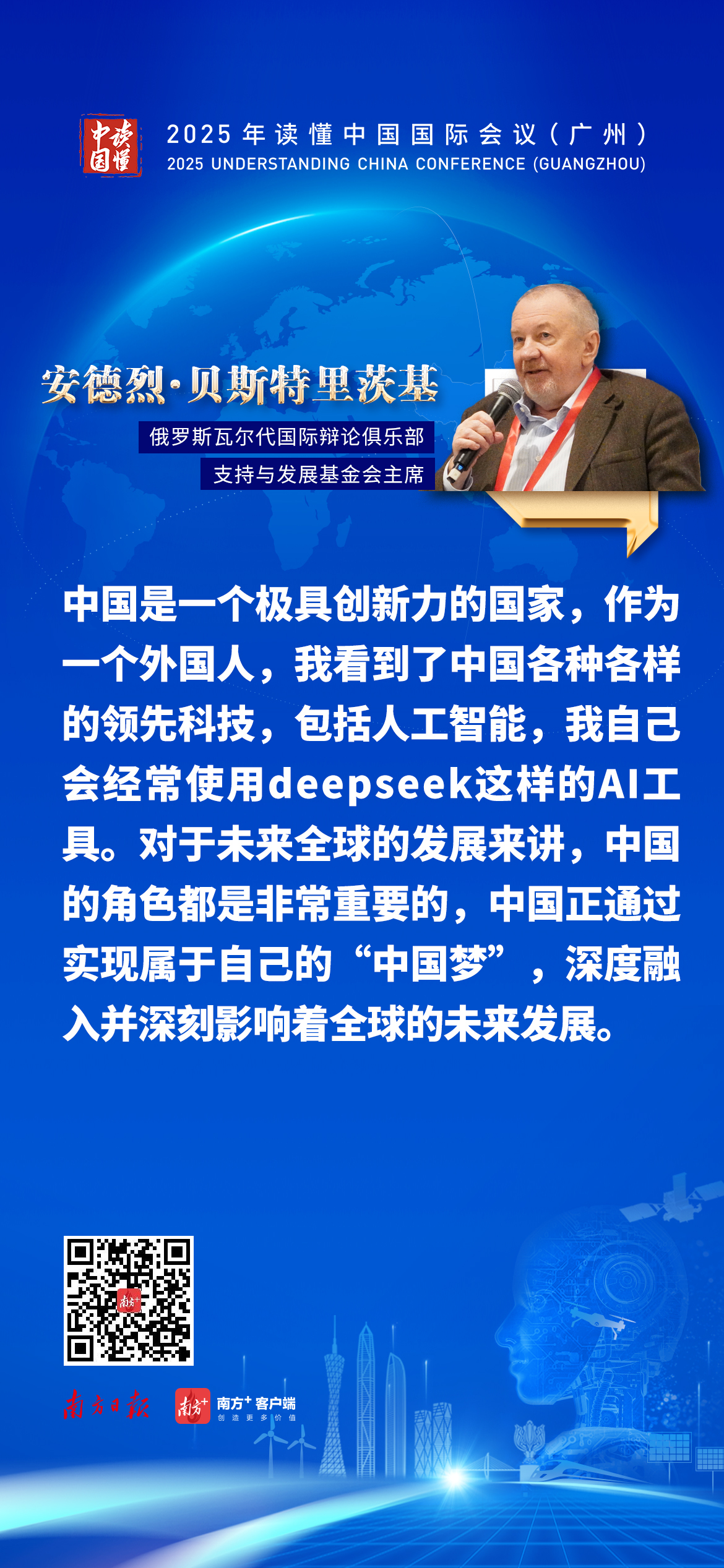 11月30日至12月2日,2025年“读懂中国”国际会议在广州举办。俄罗斯瓦尔代国际辩论俱乐部支持与发展基金会主席安德烈·贝斯特里茨基在现场接受采访时,以自身使用中国人工智能产品DeepSeek的体验为引,指出中国在数字技术、人工智能等多个科技领域展现出全球领先的创新实力。他强调,这种创新力不仅推动了中国自身的发展,更在未来全球进步中扮演重要角色。